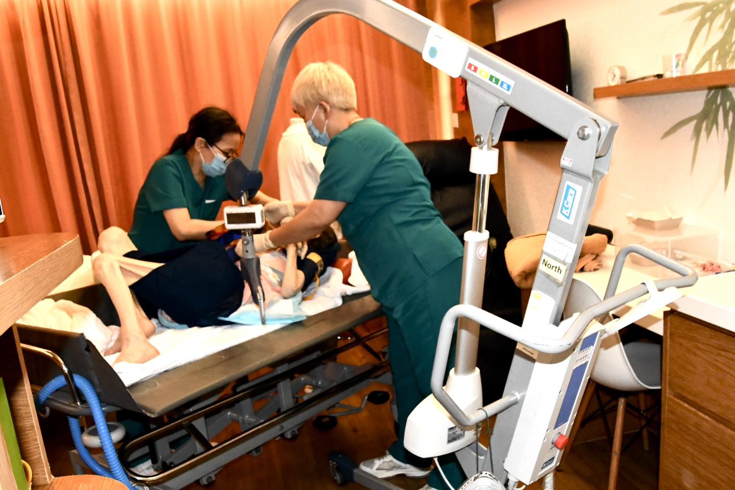 早前,兩位護理員將吊機和沐浴床推進病房,為一位臥床的婆婆沖涼。陪伴者一邊播放婆婆愛聽的音樂,護理員一邊將婆婆由病床轉移至沐浴床再推到洗手間。護理員互相配合,輕柔的為婆婆洗頭、沖涼、抹乾身、換衣服,全程大約30分鐘,期間婆婆神態輕鬆,不時面露笑容。沐浴過後,婆婆坐在大班椅上,欣賞了一會窗外的景致,感覺悠然自得。