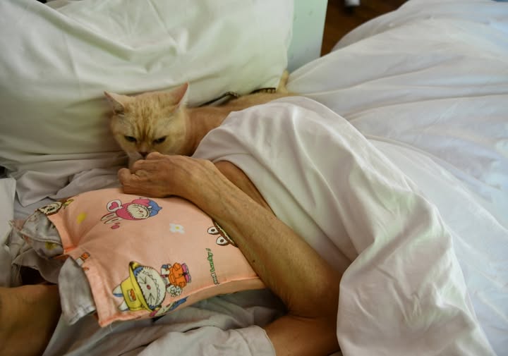 性格樂觀、親切友善的何伯,兒女早已長大,沒有甚麼放心不下,唯獨記掛家中幾頭貓。知道院舍歡迎貓狗等寵物探訪,家人專程帶來愛貓與他相聚。我們前往病房探望何伯當天,剛巧兩隻貓咪也在場,只見牠們一左一右的俯伏在主人身邊,靜靜地守候,輕撫又親吻,場面十分溫馨。其中一頭名叫「肥仔」的橘貓黏牢何伯,戀戀不捨的圈著他手臂,彷彿給他送上支持和安慰,盡顯美善。